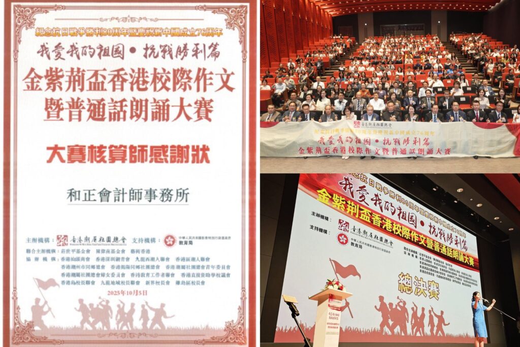 和正会计师事务所荣幸受邀担任「我爱我的祖国・抗战胜利篇」金紫荆杯香港校际作文暨普通话朗诵大赛总决赛的评分核数机构,见证青年学生的精彩演绎,确保比赛的公平公正与透明度。